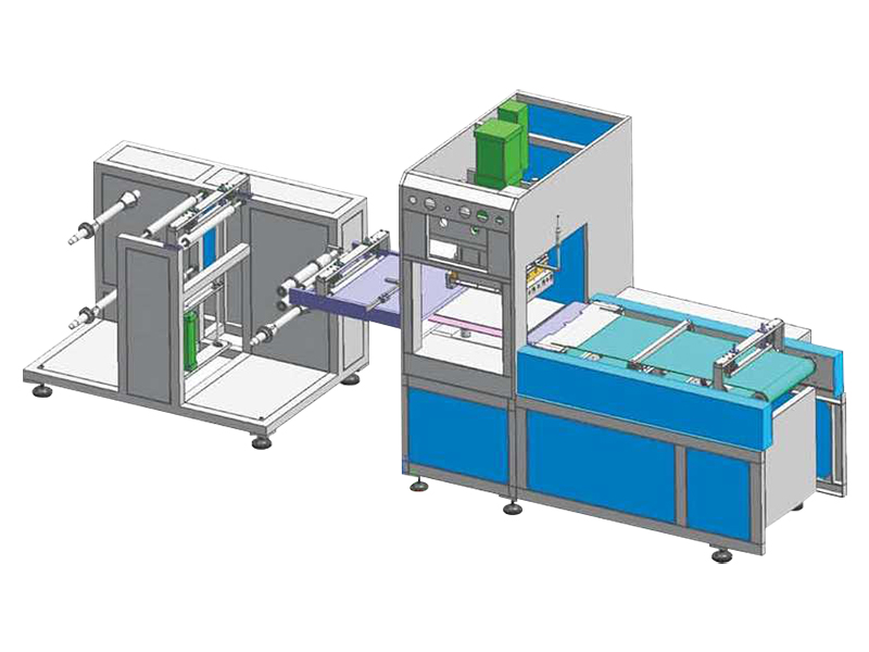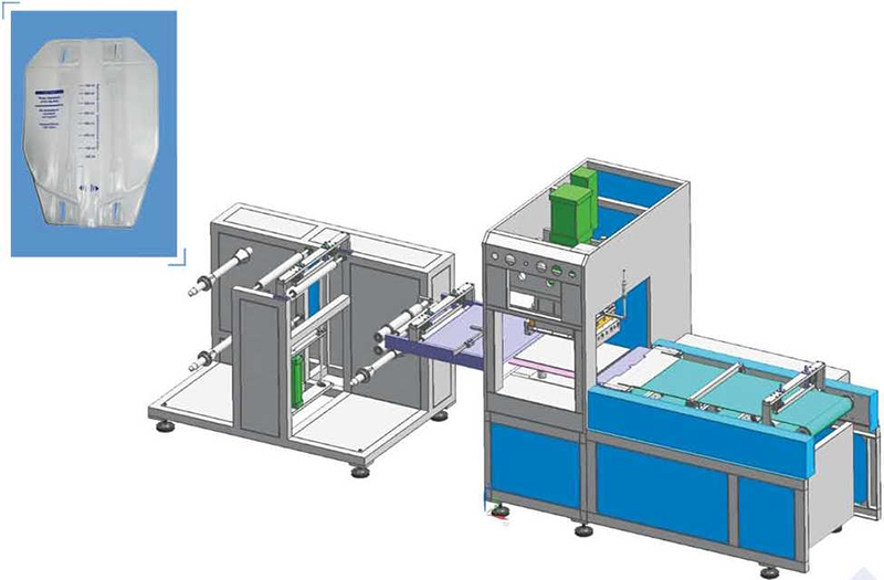 PVC腿袋等一次性医用袋薄膜同步焊接、冲切,主要针对底膜有无纺布或者复合无纺布的产品。
